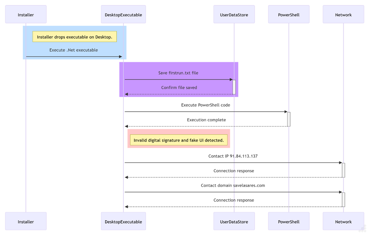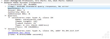 During routine network monitoring and analysis, a DNS response was captured that resolved the domain savelasares.com to the IP address 91.84.113.137.
