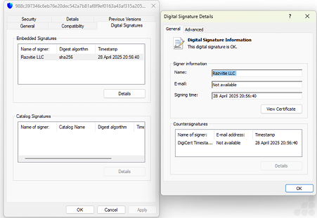 Also it has digitally signend signature of Razvtie LLC with serial number “299e1965e5adbf80ad8d73d9”.