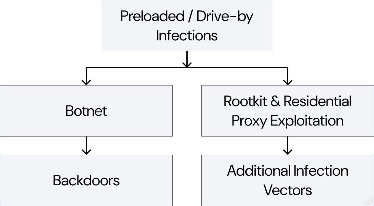 - Users unknowingly purchase pre-infected devices already part of the botnet.