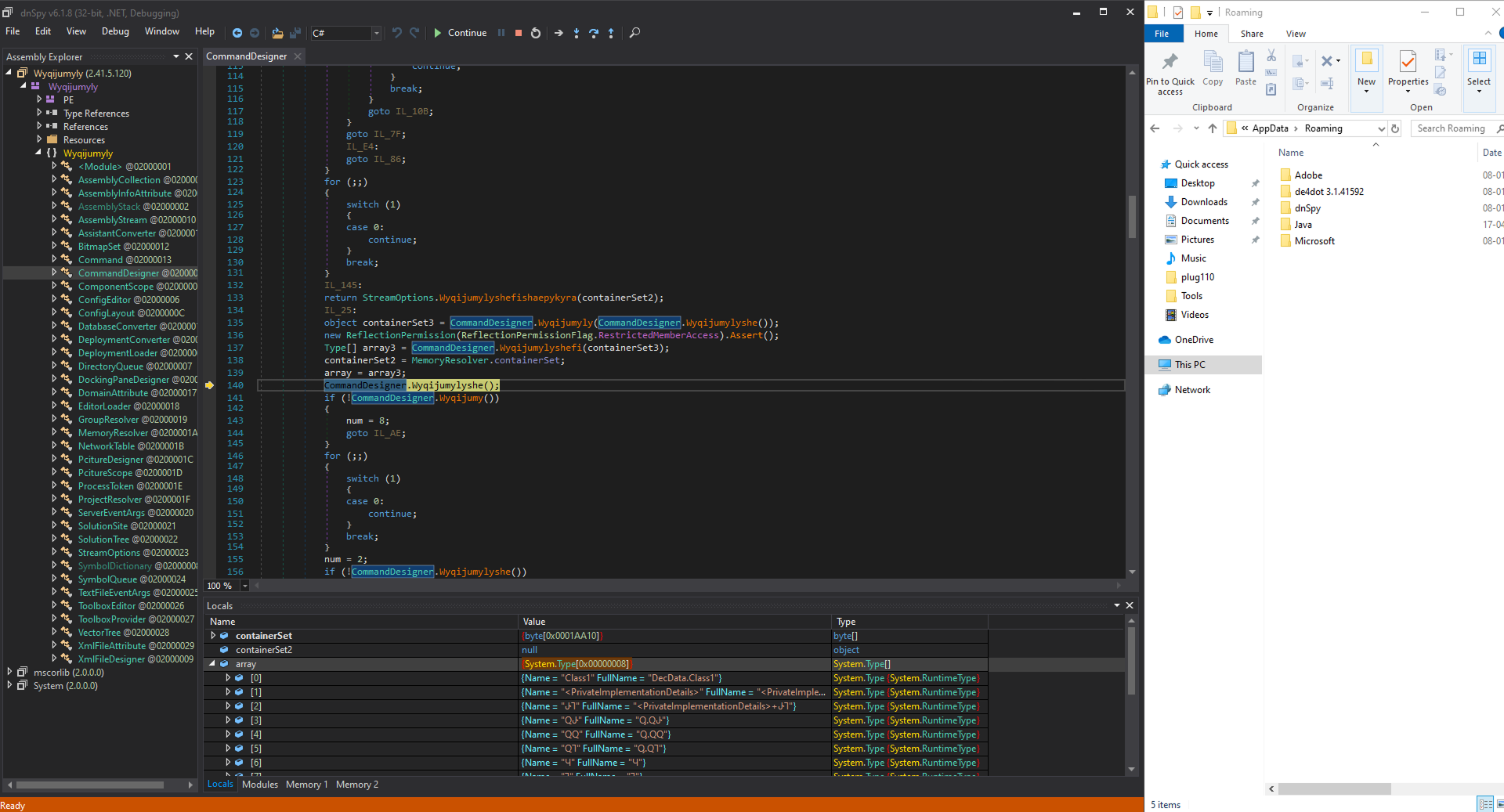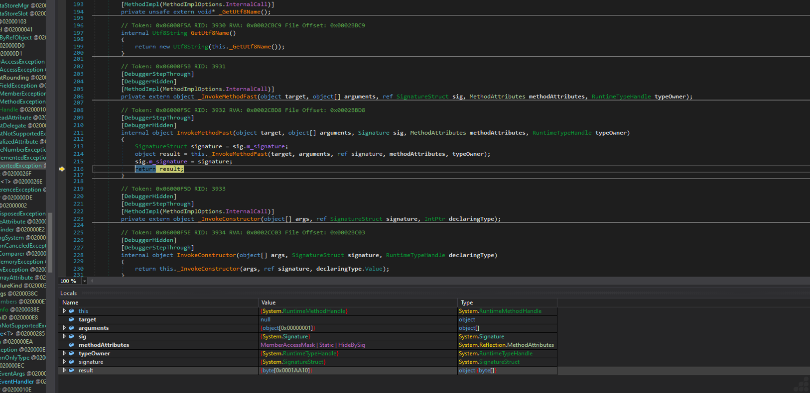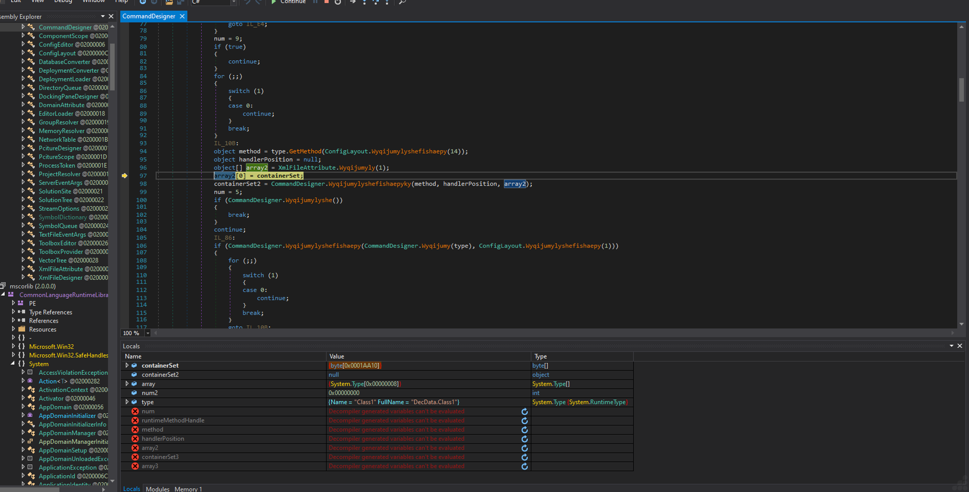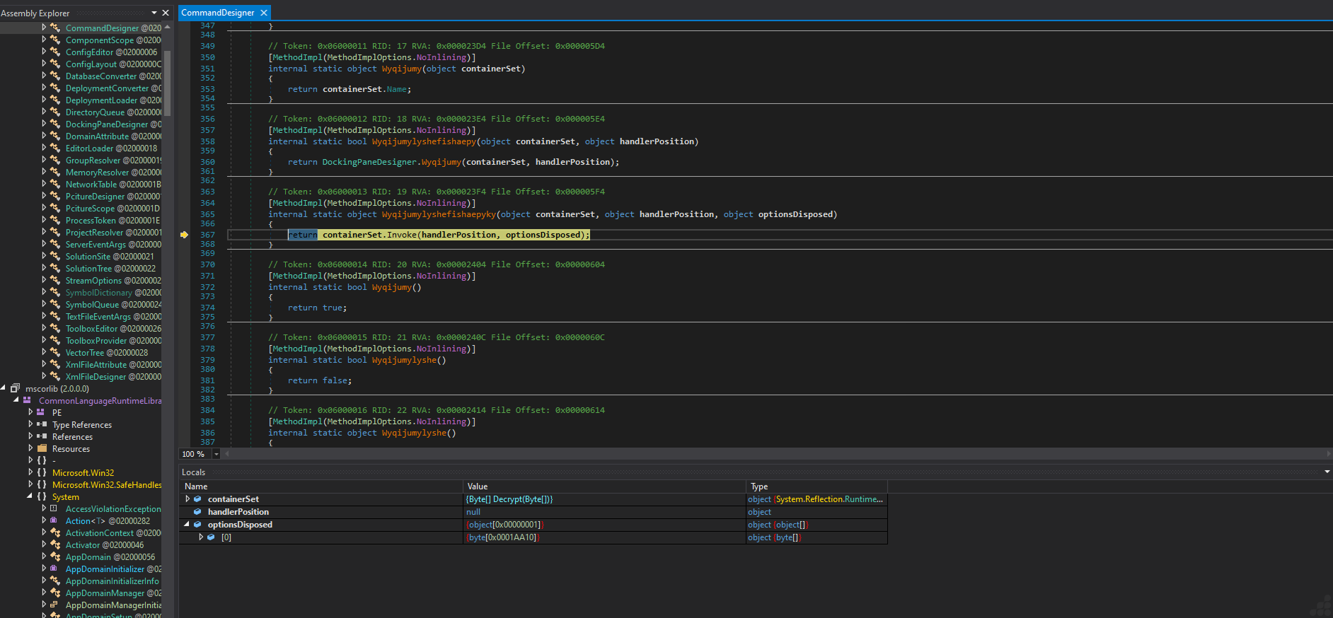 Post-return, the debugger traces into the RuntimeMethodHandle (a low-level CLR structure for method representation), retrieves its resolved metadata, and re-enters the CommandDesigner method, suggesting cyclic behavior in the assembly. As shown in the image below.