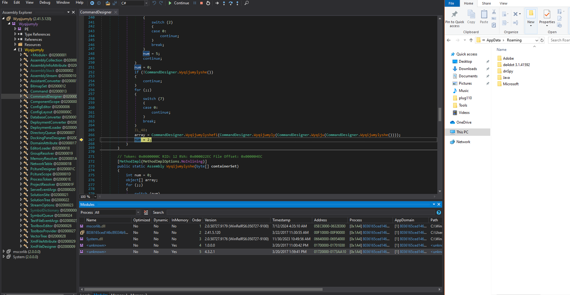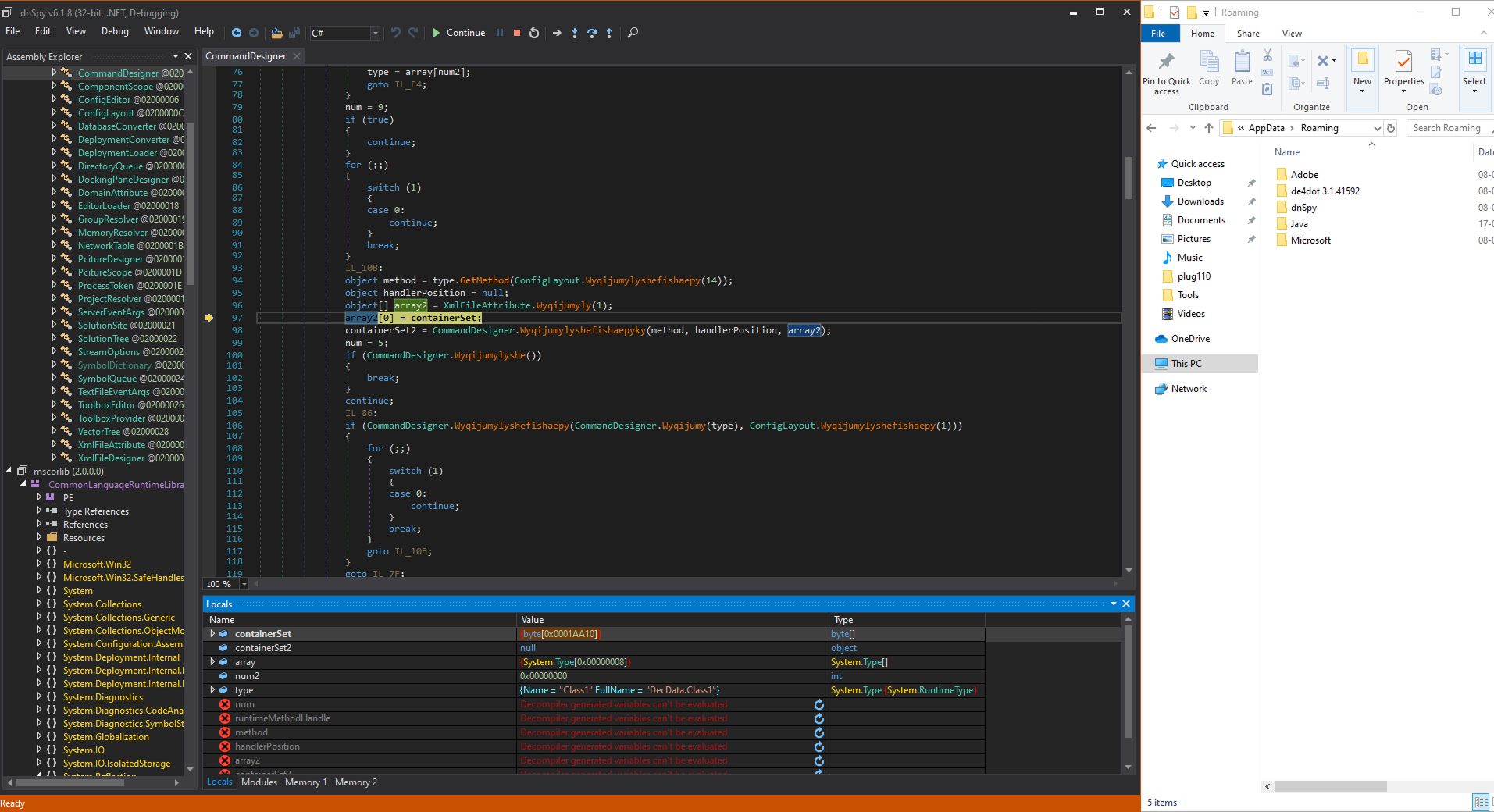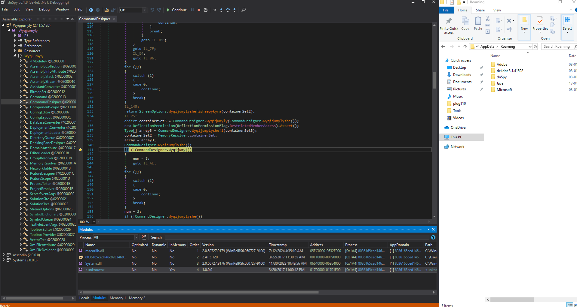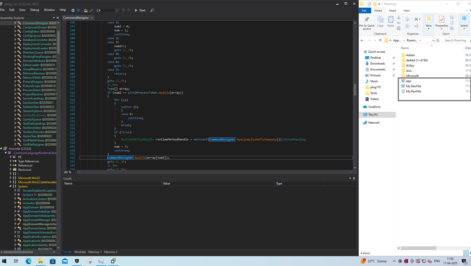 Post-return, the debugger traces into the RuntimeMethodHandle (a low-level CLR structure for method representation), retrieves its resolved metadata, and re-enters the CommandDesigner method, suggesting cyclic behavior in the assembly. As shown in the image below.