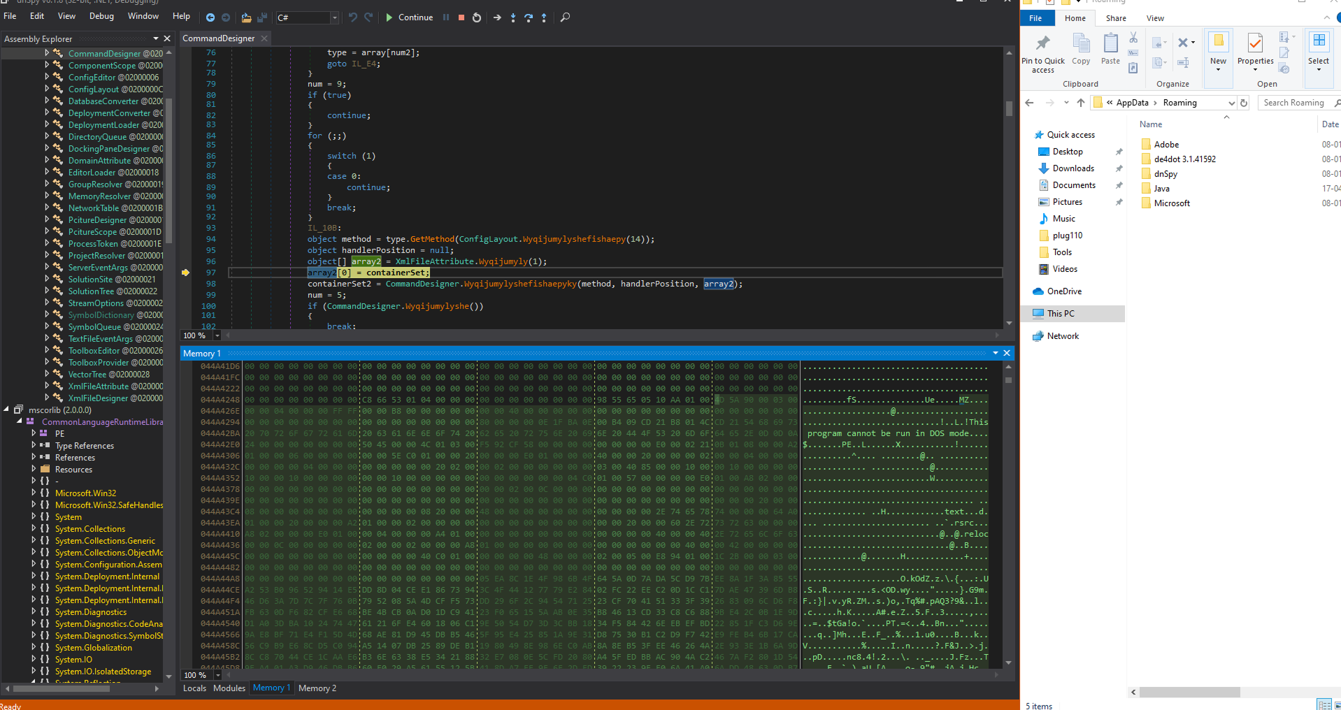 “Post-debugging validation confirms that the array element array2[0] has been successfully reinitialized within the ContainerSet data structure. A corresponding memory dump (depicted in the attached image) reveals the persistence of this state within a Portable Executable (PE) file’s binary structure during runtime memory analysis.”