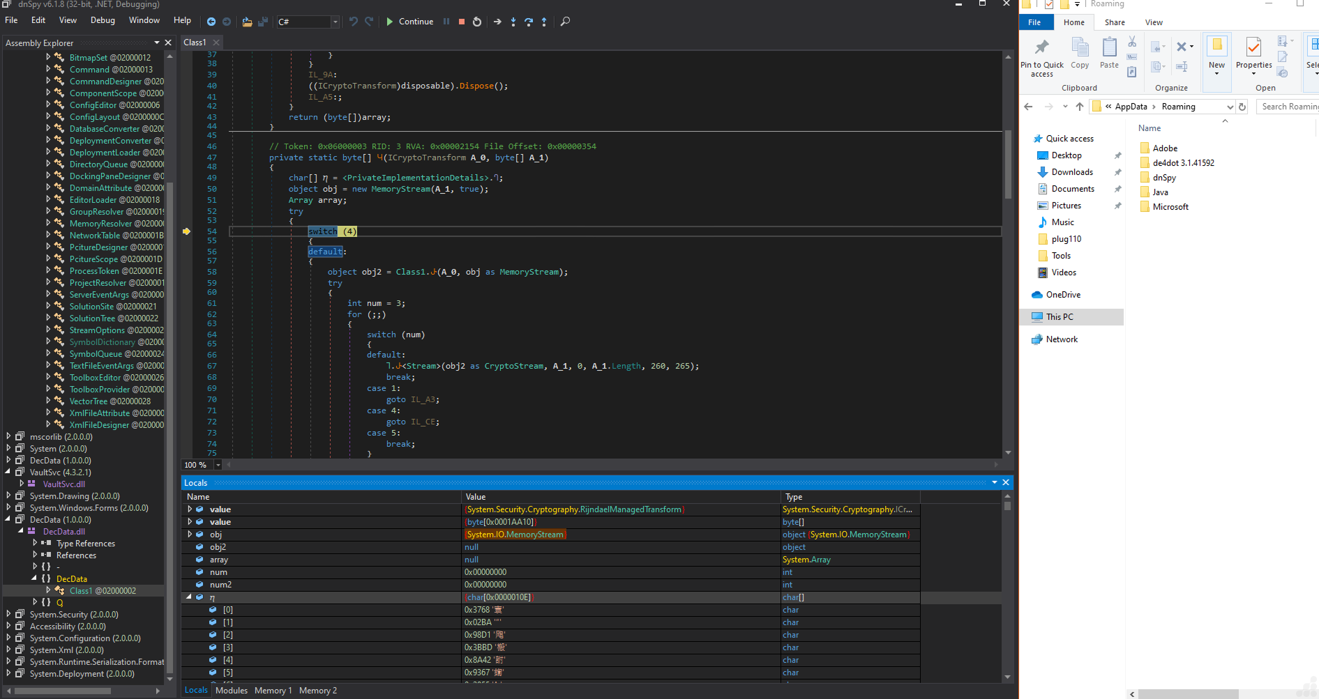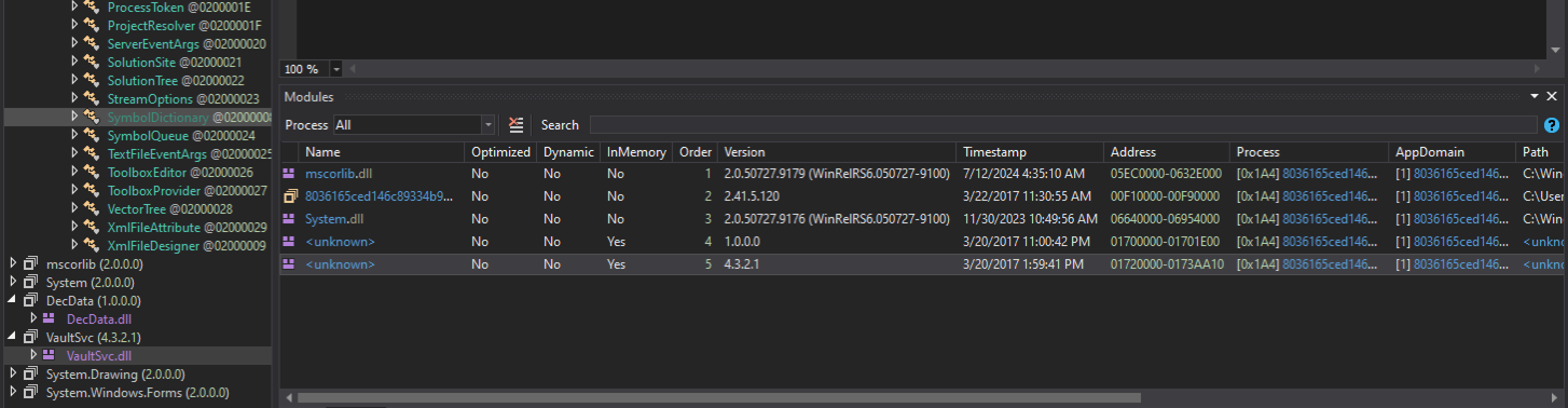 The following unknown files, which point to the mapped DecData.dll and VaultSvc.dll in memory, are visible in the image below.