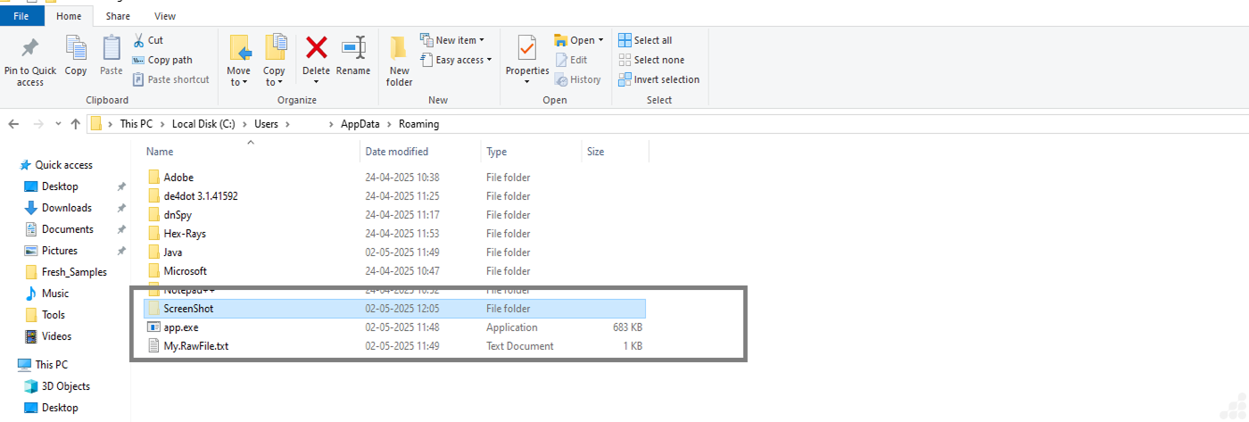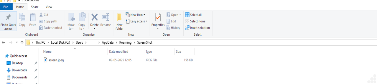 Saves the screenshot as screen.jpeg in a hidden directory: %APPDATA%\ScreenShot\screen.jpeg