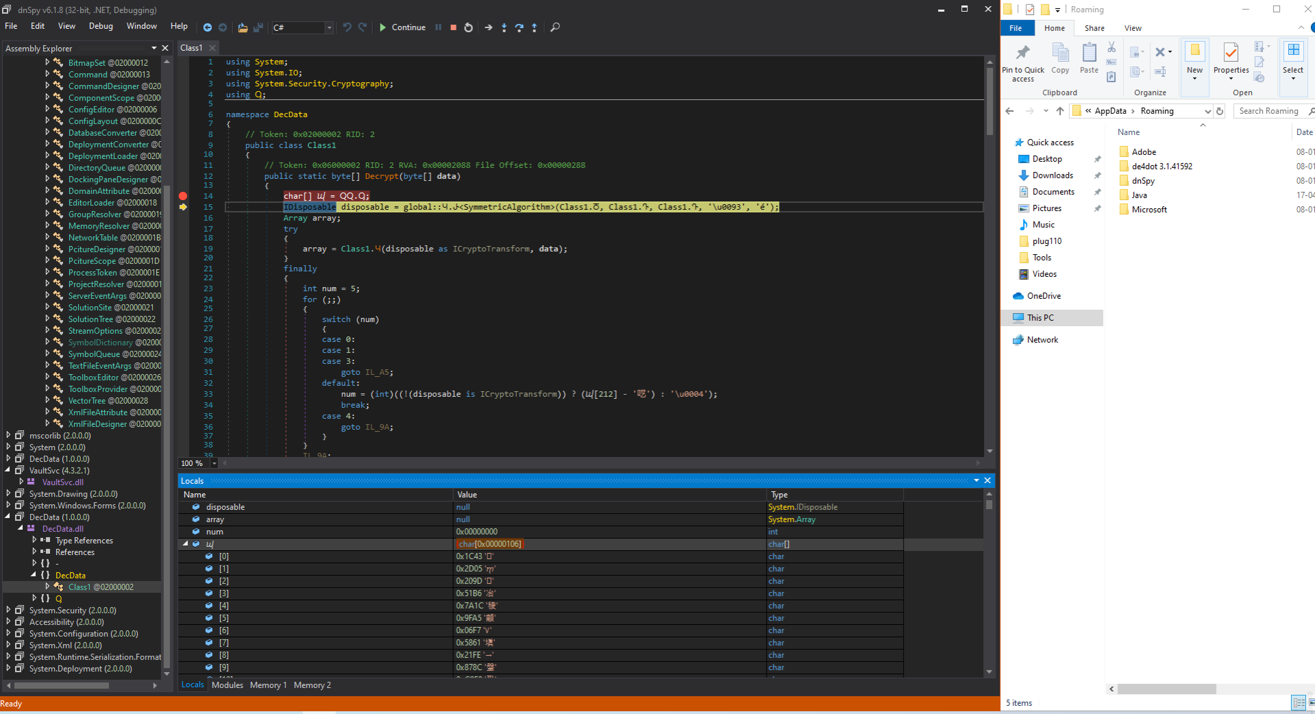 Analysis of the DecData.dll identified a Decrypt function utilizing a hardcoded character array with non-ASCII symbols (ɰ, η), stored as Unicode literals for obfuscation or key derivation.