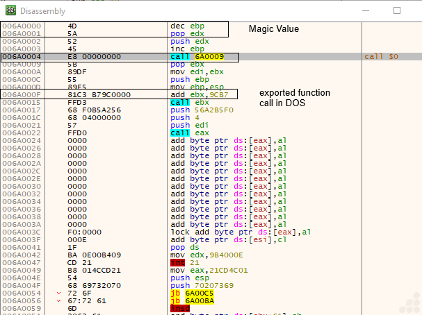 - The instruction at offset 0x6A0009 is an immediate call to a distant address, which is commonly seen in position-independent shellcode or reflective DLL injection for resolving runtime addresses.