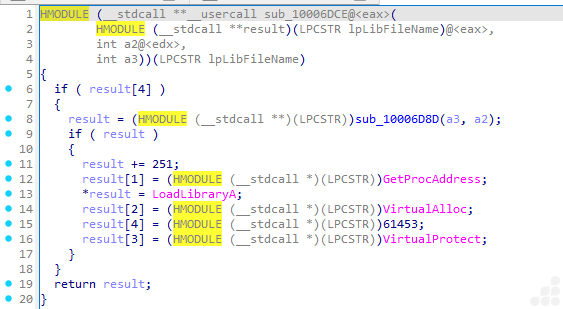 The code adds an offset (result += 251;) to store API addresses, likely as part of stealth or obfuscation. The presence of an API resolver like this strongly indicates attempts to execute payloads without relying on the Import Address Table (IAT).