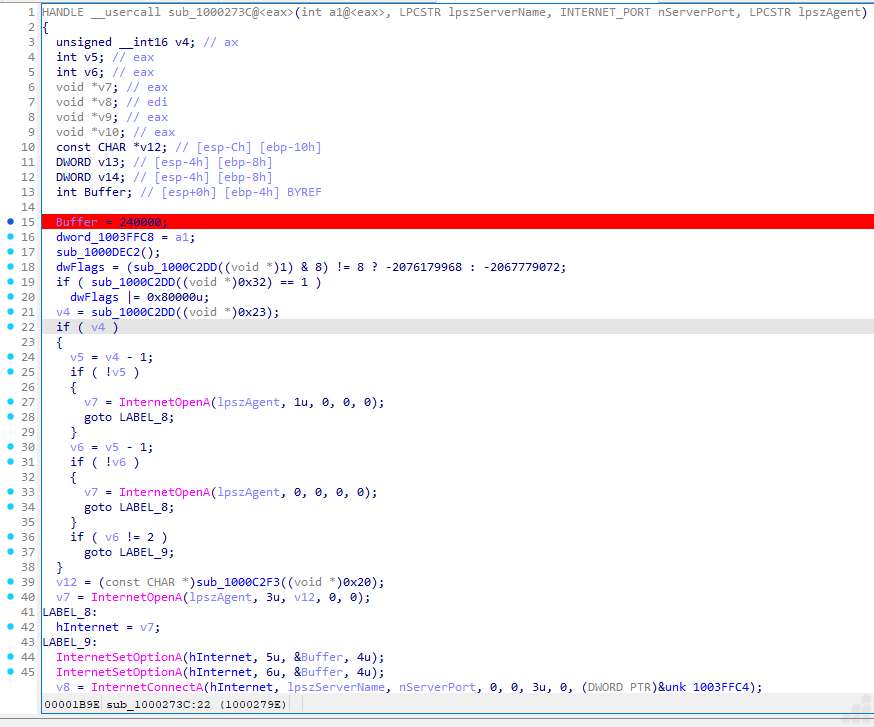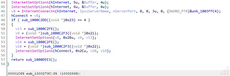 The file is using InternetOpenA, InternetConnectA, and InternetSetOptionA api for HTTPS connections in the Wininet library. The code also manages flags, buffers, and agent strings typically required for flexible, configurable malware networking. Such blocks are standard in many families of malware for backdoor activity that need to establish stealthy web-based C2 channels.