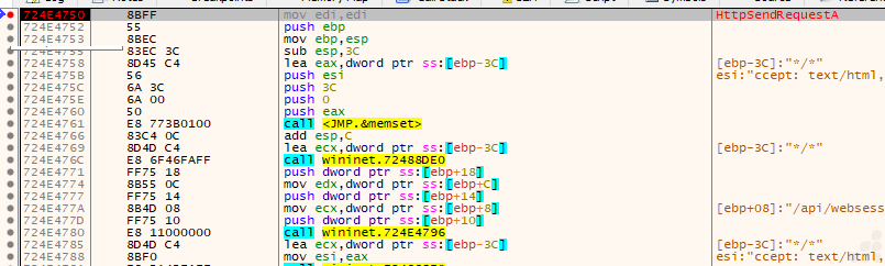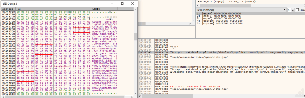 In the above Fig.23, you can see that the string loaded on the stack is visible in the debugger and memory views as contiguous ASCII in buffers. It is pushed onto the stack immediately before an HTTP request. The session information ensures that each HTTP request sent is tracked and associated with the same infected host for C2 operations or data uploads. This design allows the malware to masquerade as normal web traffic, often bypassing proxies, firewalls, and network monitoring with minimal risk of detection, especially when user-agent strings and session patterns closely mimic those of a legitimate browser.