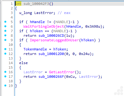 - ImpersonateLoggedOnUser: Attempts to impersonate a user if a valid token handle is available.