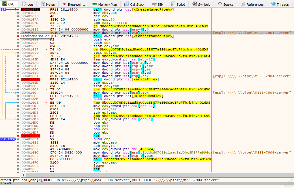 - CreateNamedPipeA – Creates the named pipe: \\.\pipe\MSSE-7904-server