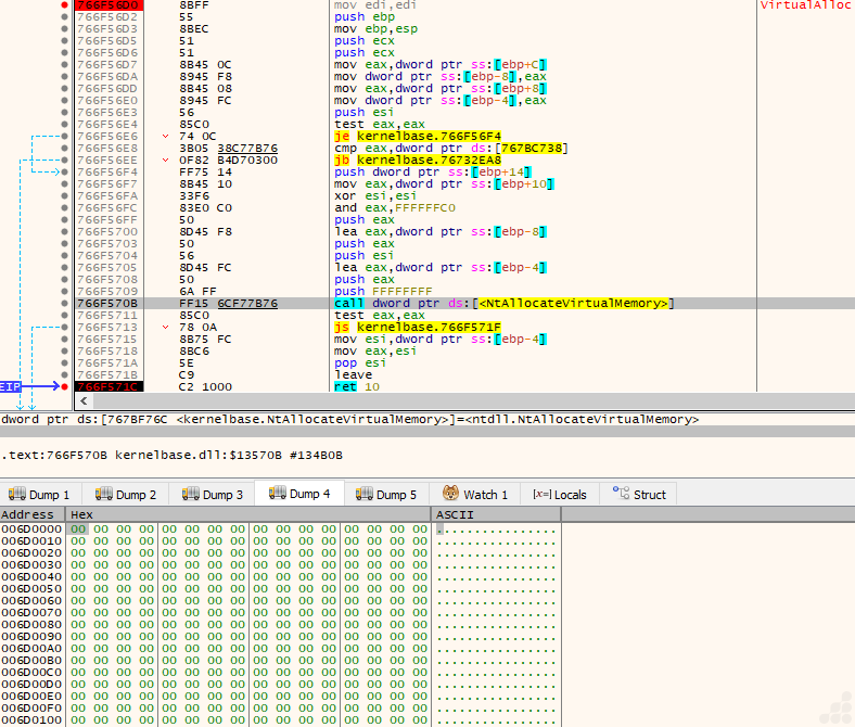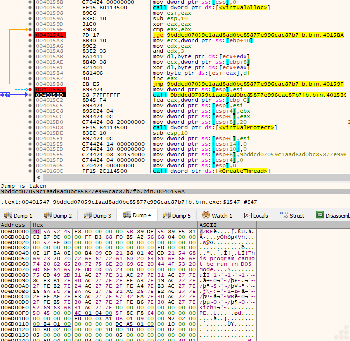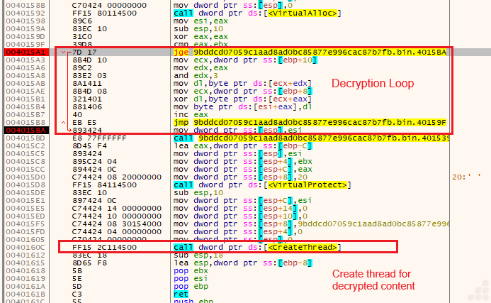 “Basically, during execution, the loader allocates virtual memory, decrypts the next stage into it, adjusts memory protections by changing the protection to PAGE_EXECUTE_READ, and creates a thread to execute the decrypted code.” (as depicted in Figure 7)