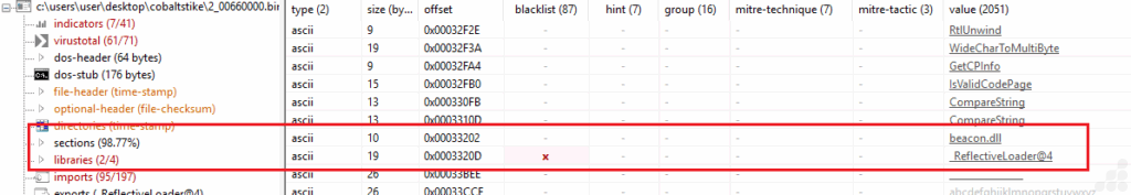 We examined the executable’s memory dump and analyzed its strings to find connections with our dynamic analysis. During this investigation, we found a reference to “beacon.dll,” which is likely the DLL version of the Cobalt Strike beacon. When we loaded the PE file into PeStudio, we also discovered an export named “_ReflectiveLoader@4,” a well-known export for Cobalt Strike DLLs. This export is typically associated with reflective DLL injection, allowing the beacon to be loaded directly into memory without touching the disk. This behavior is common for Cobalt Strike payloads and is a strong indicator of its presence in the sample.
