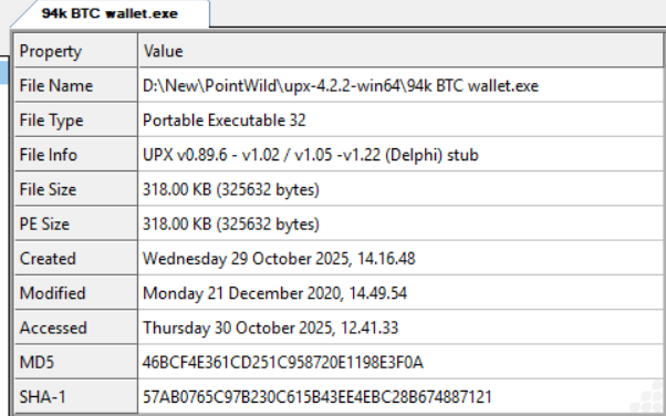 upx.exe -d “94k BTC wallet.exe” -o Unpacked94kBTCwallet.exe