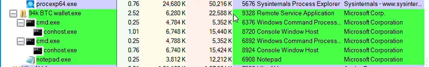 Upon execution, the “94k BTC wallet.exe” spawns multiple cmd.exe and conhost.exe processes, as seen in the process hierarchy. These child processes indicate that the malware executes a series of internal commands to establish its runtime environment.