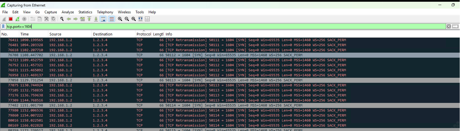 During network analysis, the unpacked DarkComet sample was observed attempting to establish a TCP connection to kvejo991.ddns.net on port 1604, which aligns with the default command-and-control (C2) port commonly used by the DarkComet RAT family. The connection logs showed multiple retransmissions, suggesting that the remote server was either offline or blocking incoming connections at the time of execution. Despite the failed connection, these repeated attempts clearly indicate active C2 beaconing behavior, confirming that the malware was trying to communicate with its operator to receive commands or exfiltrate data—behavior that is consistent with known DarkComet RAT activity patterns.
