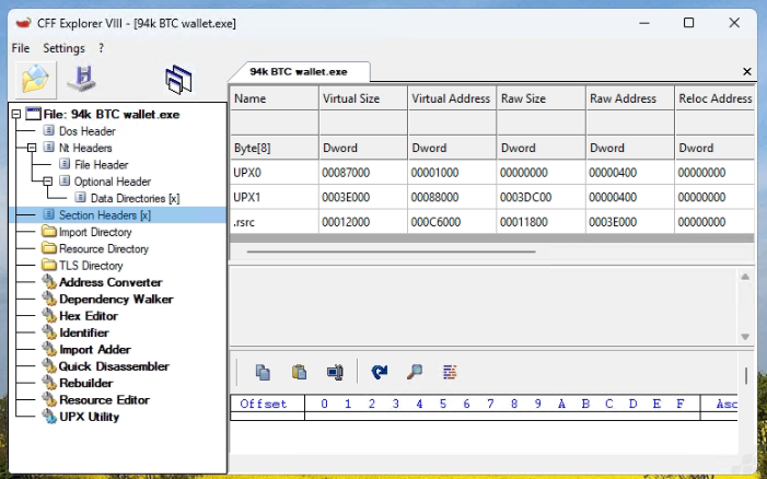 During static analysis of the suspicious executable “94k BTC wallet.exe”, the first step was to check the PE (Portable Executable) structure using CFF Explorer. This revealed that the sample was packed with UPX (Ultimate Packer for Executables) a common method malware authors use to compress and obfuscate executables to evade detection.