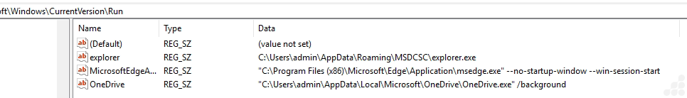 | Registry Key | HKCU\Software\Microsoft\Windows\CurrentVersion\Run\explorer -> C:\Users\admin\AppData\Roaming\MSDCSC\explorer.exe |