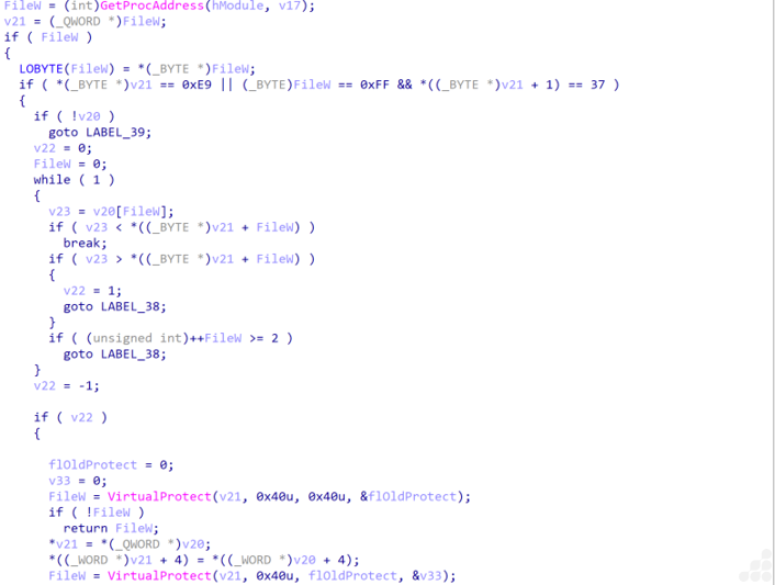 - The Dragonforce verifies if one of the DLLs listed above contains hook functions or not. If present it modifies the protection of the function code to 0x40 (PAGE_EXECUTE_READWRITE) and writes the unhooked code from the fresh-mapped DLLs . It then restores the old memory protection, as below image.