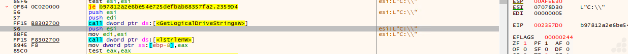 - Through GetLogicalDriveStringW API checking each drive in the victim’s machine and taking the handle of files present in drive. The use of the GetLogicalDriveStringsW API to enumerate and access each drive on the victim’s machine is a common tactic for ransomware and other malware types that need to operate across multiple drives, especially when their goal is to encrypt files or collect data.