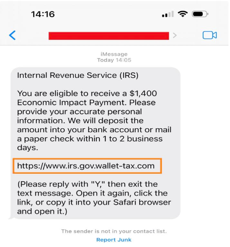Text messages pretending to be the IRS might say something like “You’re eligible for a refund, click here.” That link often leads to a fake website designed to collect your Social Security number and bank info.