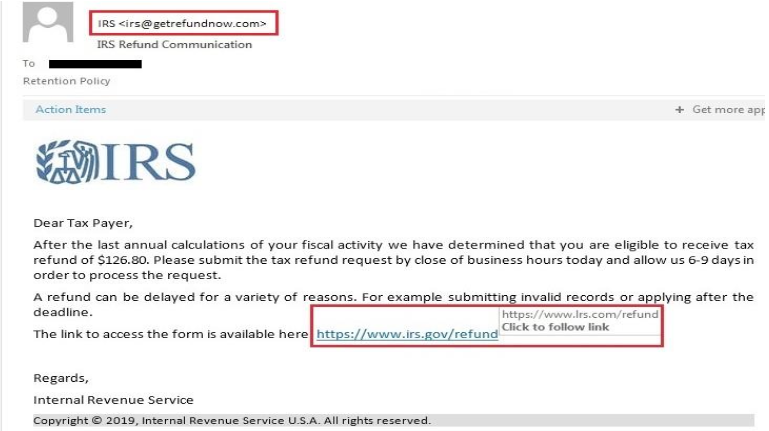 Here as we can see above in phishing email example 1 the red flags that is the sender email id and also the link in the mail which looks like official “https://www.irs.gov/refund” but the actual link embedded to it is “https://www.Irs.com/refund” which is not official IRS link.