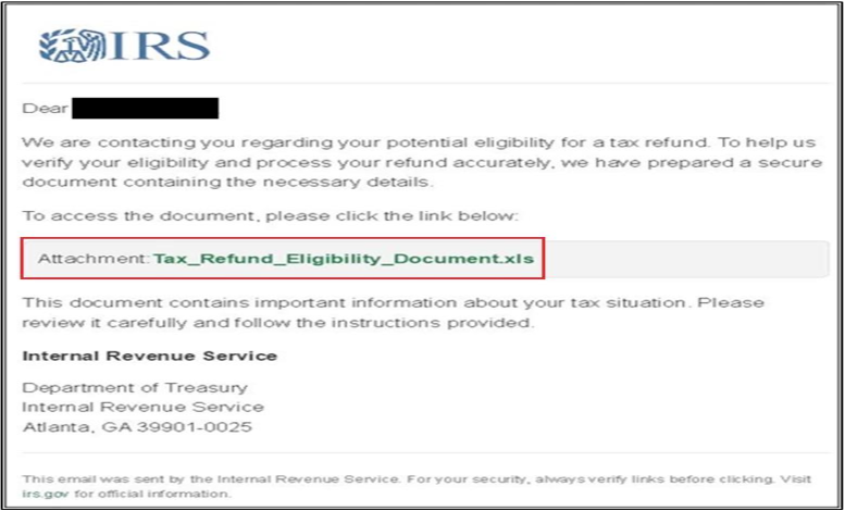- Phishing Emails pretending to be IRS alerts or refund notices