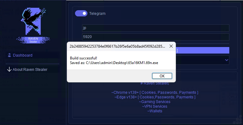 Raven Stealer targets Chromium-based browsers like Chrome and Edge, extracting passwords, cookies, payment data, and autofill entries. Its modular design and built-in resource editor let attackers embed configuration details such as Telegram bot tokens directly into the payload, streamlining deployment for even low-skilled threat actors.