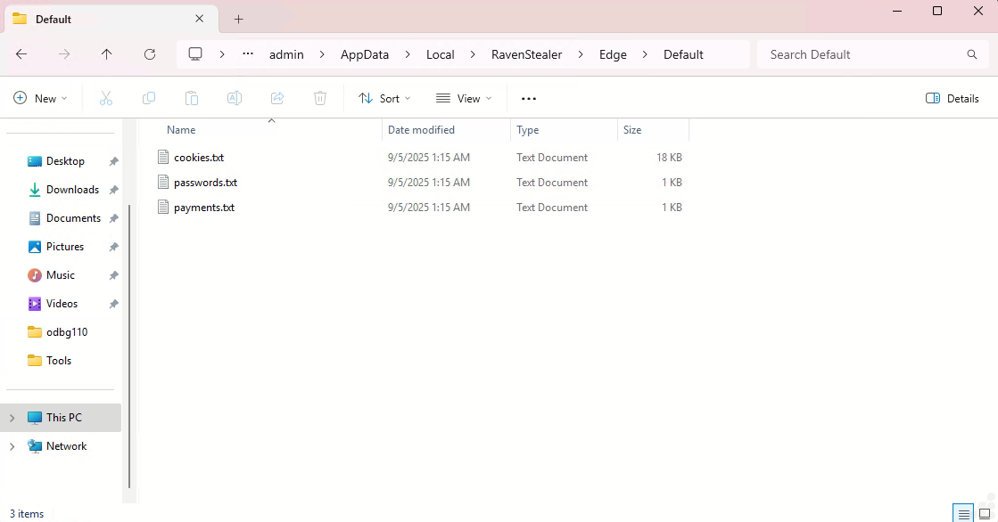 The stealer deposits extracted browser artifacts including cookies, saved passwords, and payment details into plain text files located at: C:\Users\admin\AppData\Local\RavenStealer\Edge\Default.