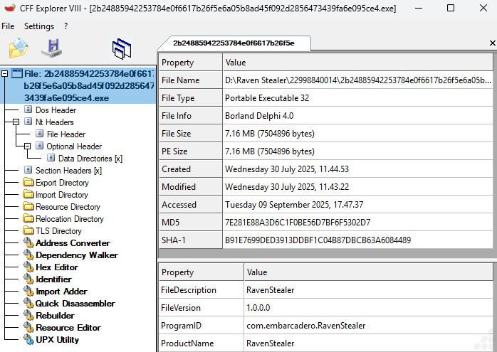 Raven Stealer is a contemporary, lightweight information-stealing malware developed primarily in Delphi and C++. Designed for stealth and efficiency, it operates with minimal user interaction while maintaining a high level of operational concealment. This malware steals credentials from various applications, harvests browser data such as cookies, autofill entries, and browsing history, and performs real-time data exfiltration via Telegram bot integration.