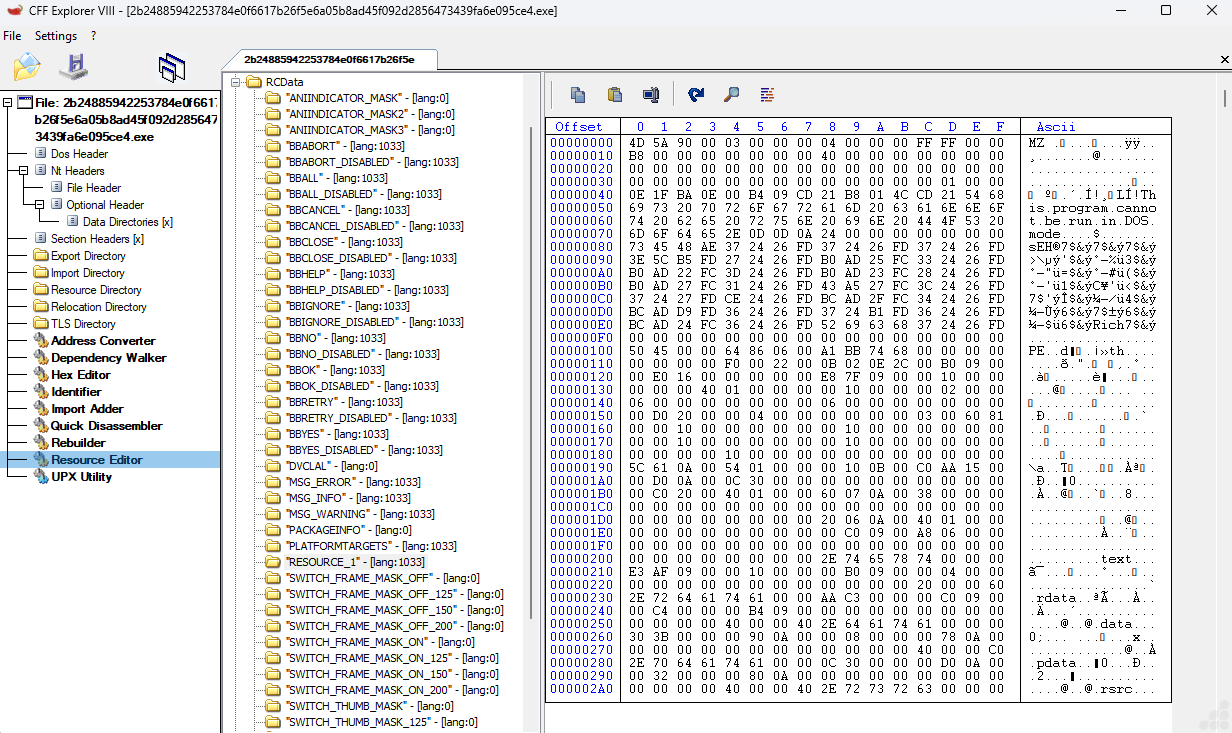 The executable is a 32-bit Windows Portable Executable (PE) compiled using Borland Delphi, as indicated by its structural markers and section naming conventions. Within its resource section, the file stores critical payload components, likely encrypted or obfuscated DLLs or configuration data used during runtime.