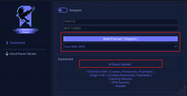 Raven Stealer is promoted via a dedicated Telegram channel. The integration of Telegram for command-and-control (C2)-like operations, combined with a streamlined user interface and support for dynamic modules, enhances the tool’s appeal within the commodity malware landscape, positioning it as a commercially viable and technically sophisticated offering.