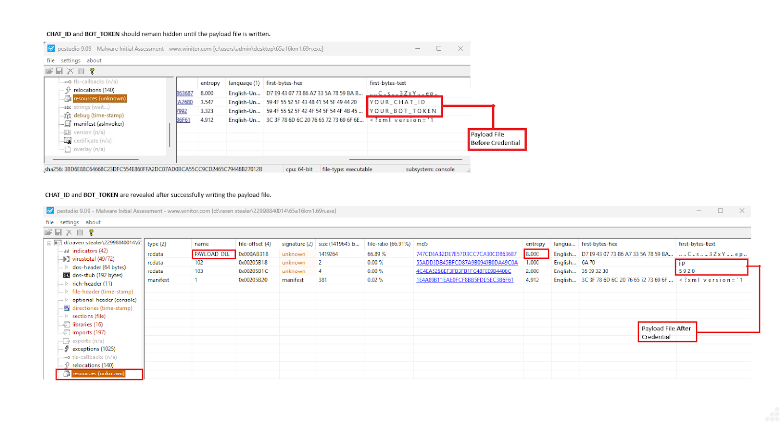 The malware embeds sensitive Telegram credentials, specifically the Chat_ID and Bot_Token as plain text within its resource section, using resource IDs 102 and 103 respectively. This unencrypted storage method poses a significant risk of credential exposure. Additionally, the sample includes a PAYLOAD_DLL as an embedded resource. Entropy analysis reveals a value of 8.0, indicating a high level of obfuscation. This DLL is likely designed for process injection, enabling the malware to execute within the context of a trusted application and evade detection.