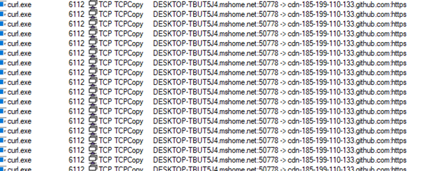Figure 14 contains suspicious activity where curl.exe repeatedly initiates outbound HTTPS connections to a GitHub-hosted domain.