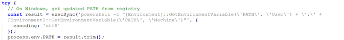 Figure 5 shows code that updates the system PATH environment variable on Windows by reading values directly from the registry using PowerShell. It combines both user-level and machine-level PATH entries and assigns them to the running process. In a malware context, this ensures that newly installed tools (such as Bun or other dropped binaries) are immediately accessible without restarting the system, helping the malicious code run smoothly and persist without raising suspicion.