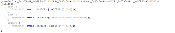 Figure 8 shows an obfuscated code section that targets cloud service credentials across multiple providers. This highlights a clear credential-harvesting capability, where the attacker attempts to extract cloud access keys and secrets that can later be abused for account takeover, lateral movement, or further supply-chain compromise.