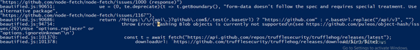 Figure 13 shows code and error output indicating that the malware uses node-fetch to communicate with the GitHub API and retrieve information about the latest releases from a public repository. It then builds a download URL to fetch a binary directly from GitHub. This behavior demonstrates how attackers leverage trusted platforms like GitHub to host and distribute malicious components, helping the activity blend in with normal developer traffic and avoid easy detection.